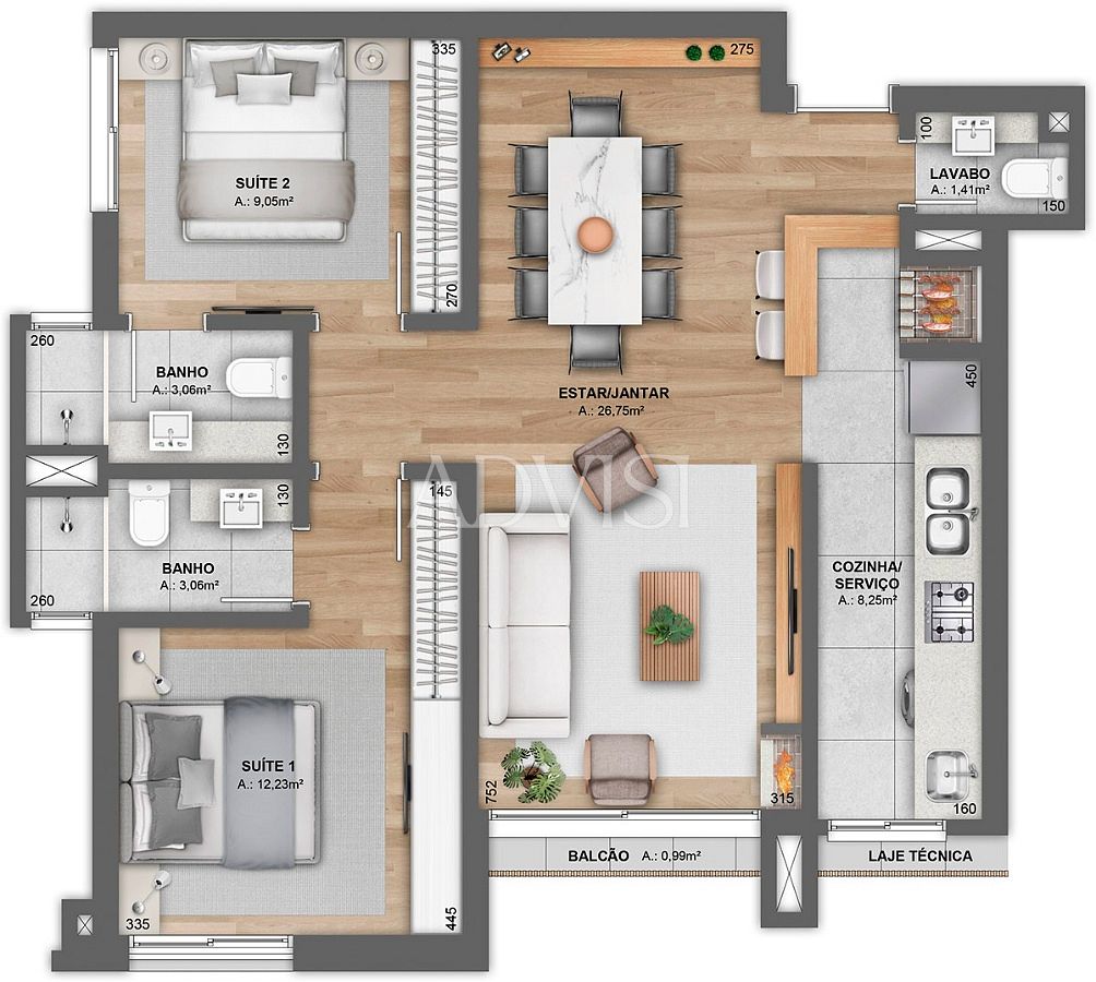 Acabamentos de alto padrão, esquadrias de PVC preto com vidros duplos, hall de entrada decorado, salão de festas decorado e equipado, fitness center decorado e equipado, playground, plantas customizáveis, port cochère com guarita.