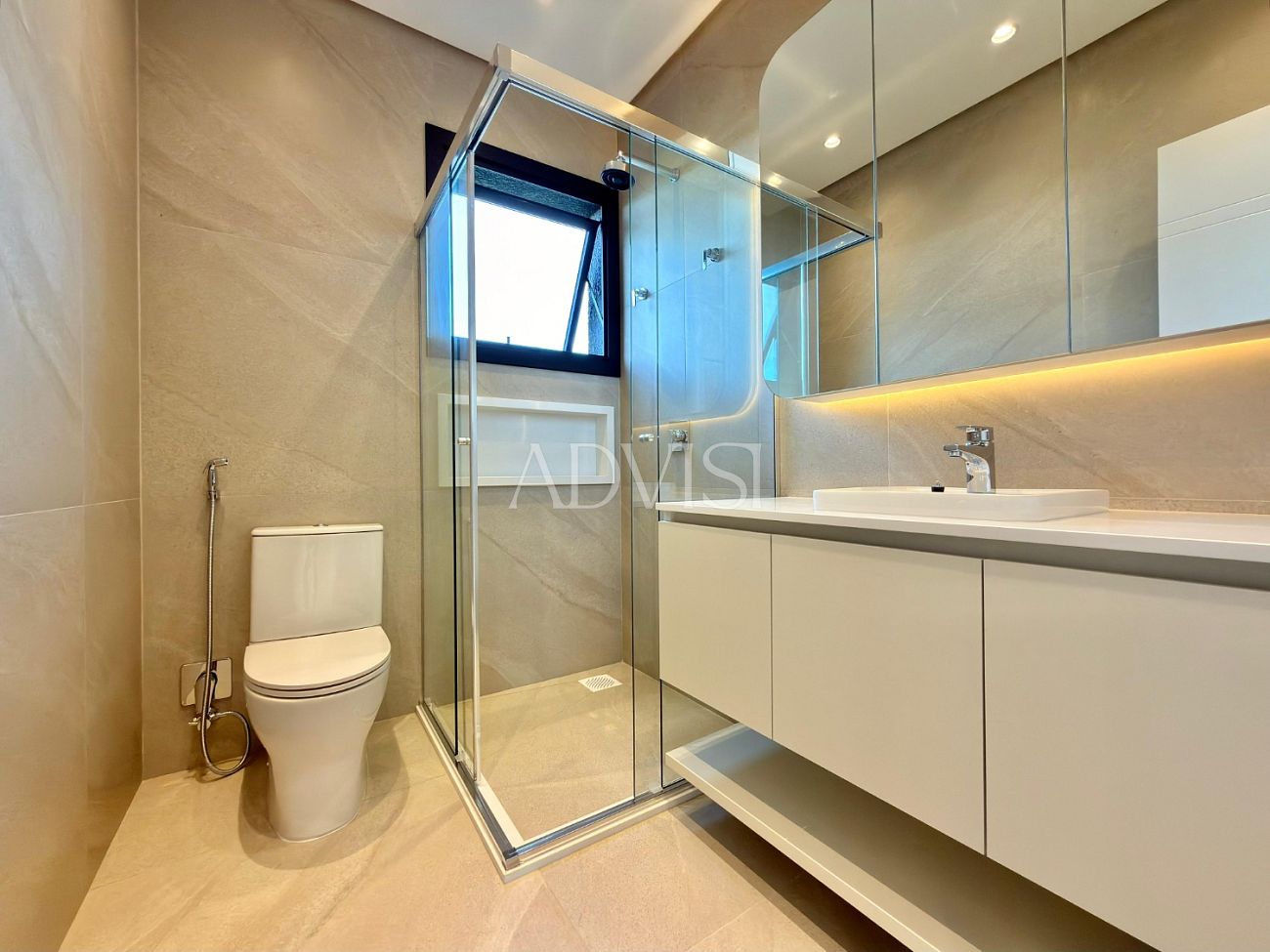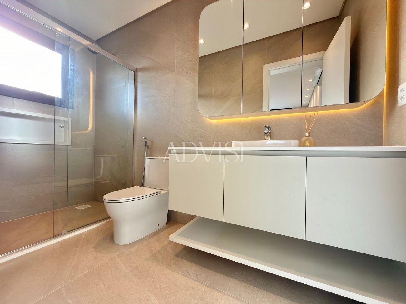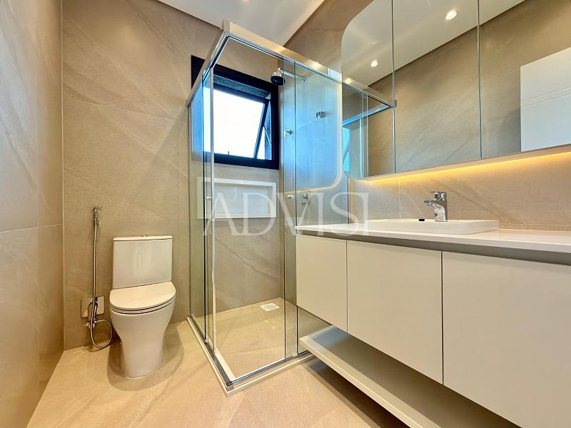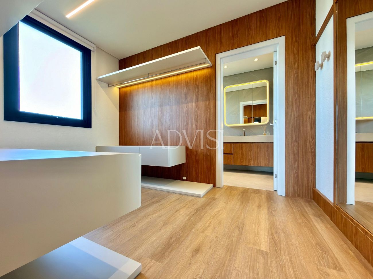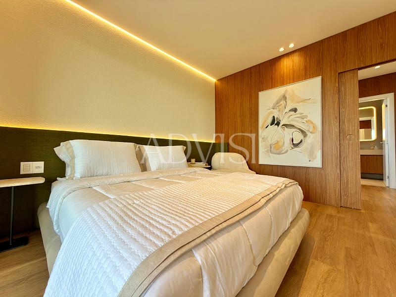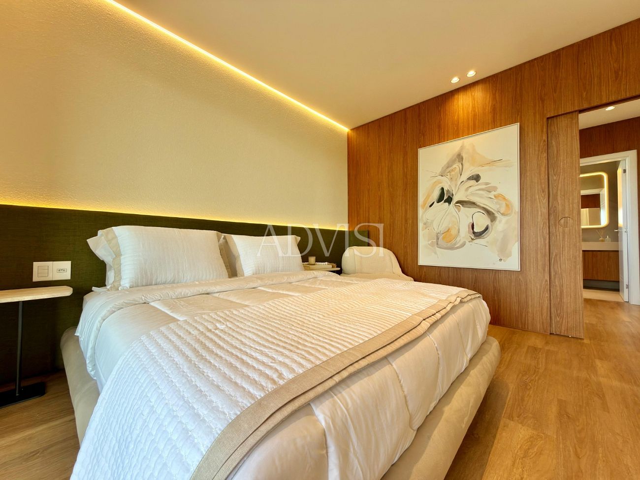 A suíte master oferece conforto e elegância, com cama queen, closet funcional e acabamentos refinados.