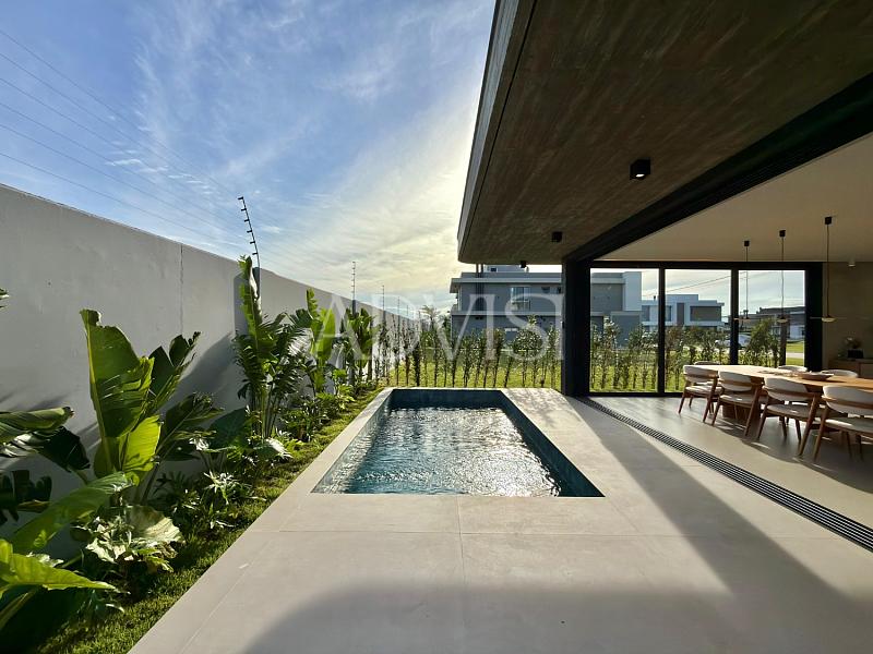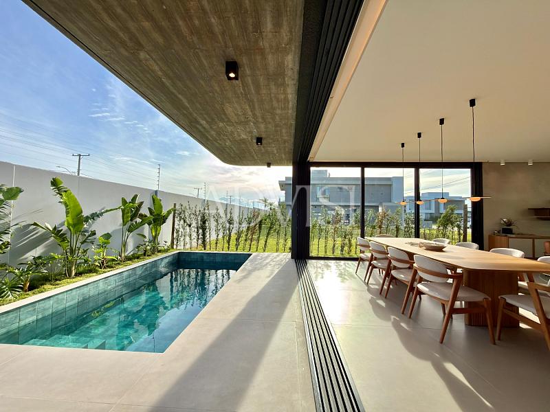 Na área externa, a casa conta com piscina em concreto, lavabo e chuveiro de apoio, além de integração direta com o espaço gourmet. O imóvel possui ainda depósito externo, 2 vagas cobertas, ar-condicionado em todos os ambientes e esquadrias em PVC, reforçando o padrão construtivo.