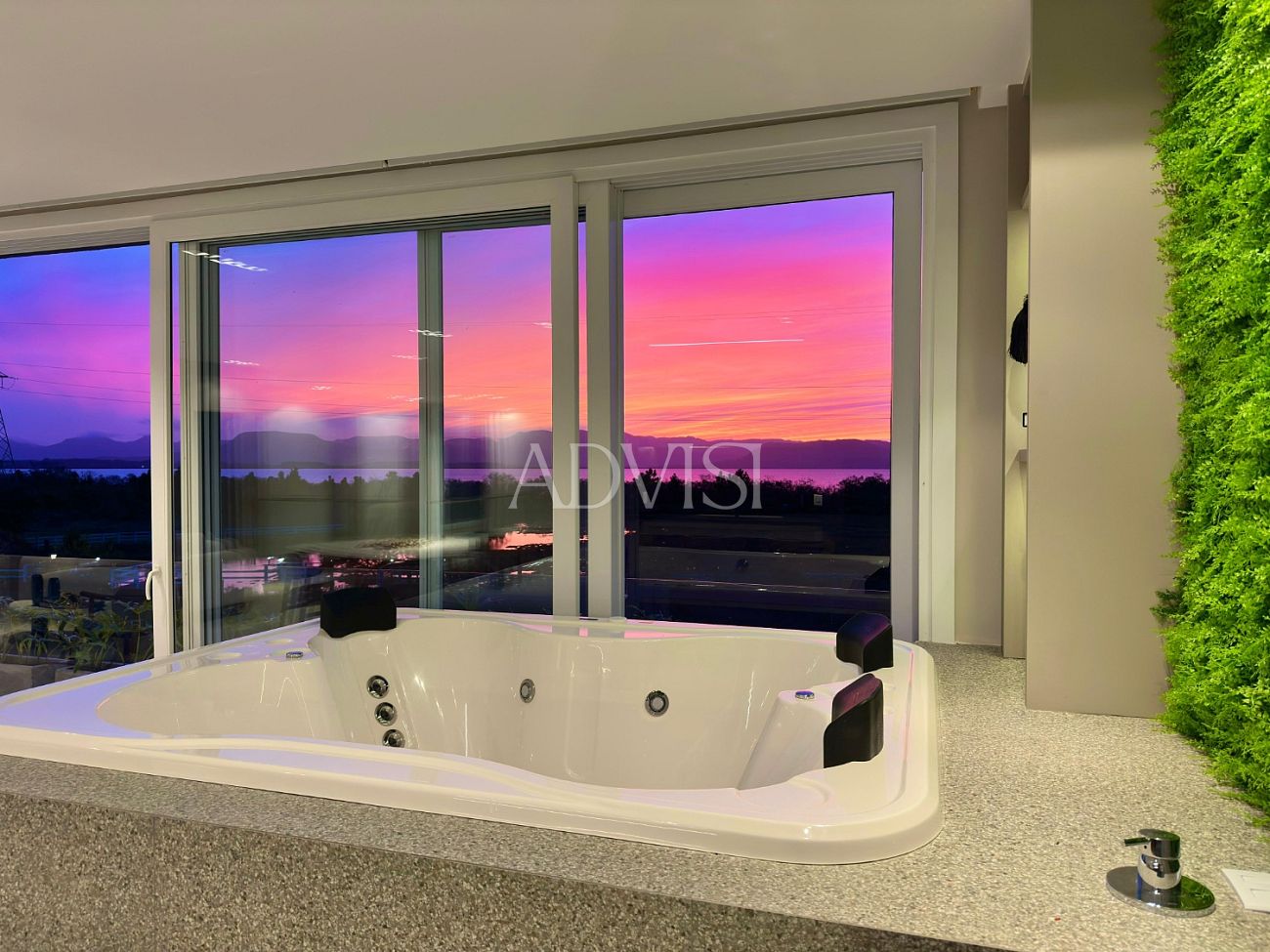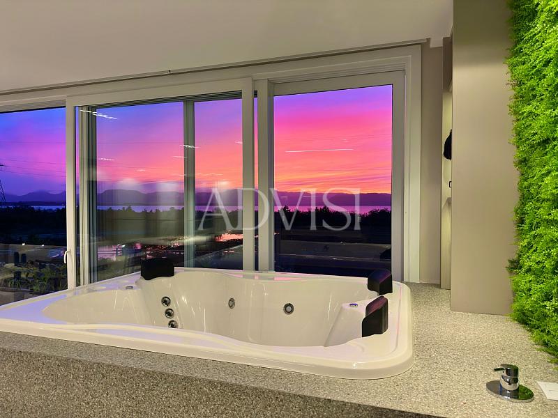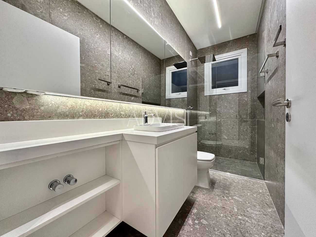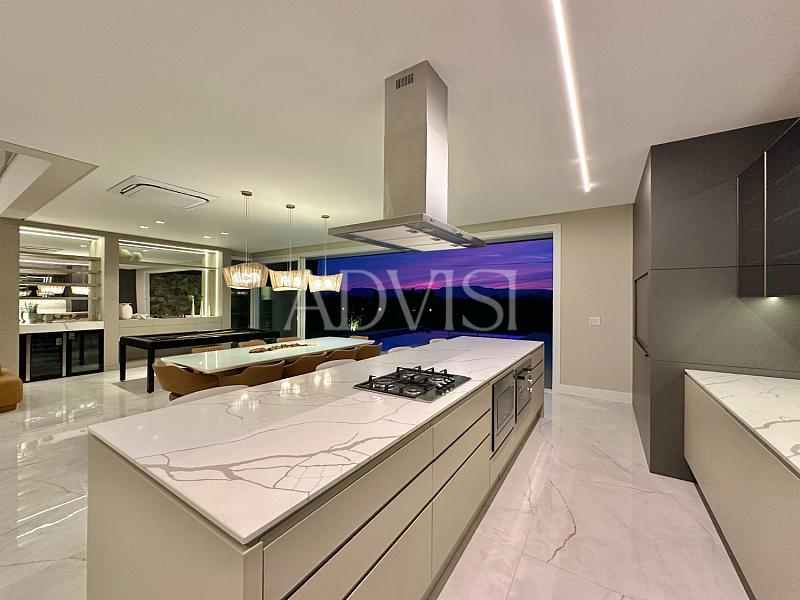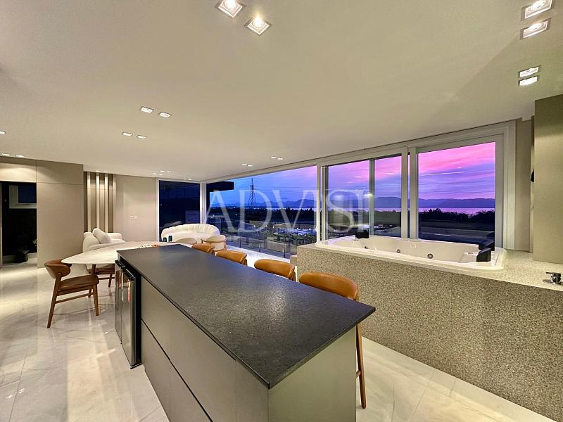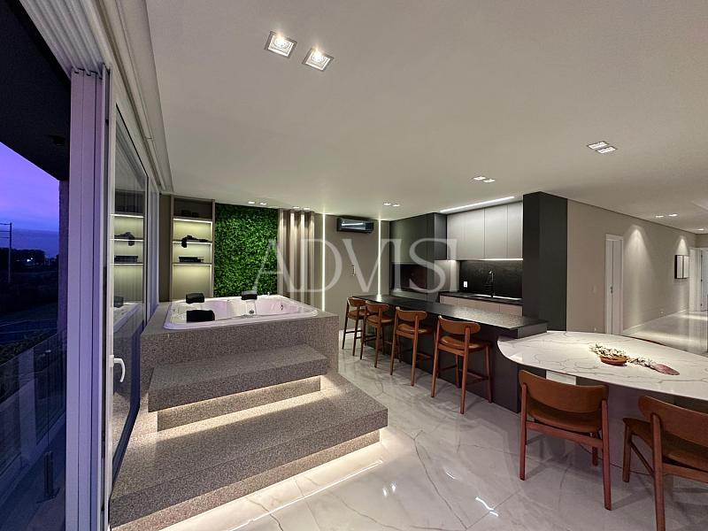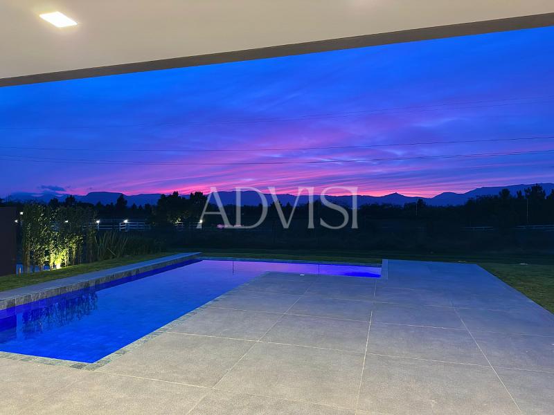 Na área externa, a piscina é um dos grandes destaques, ideal para momentos de lazer e relaxamento com vista privilegiada. As esquadrias em PVC garantem isolamento térmico e acústico, reforçando o alto padrão construtivo do imóvel.