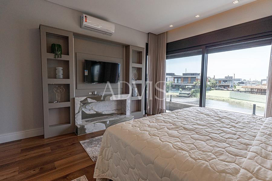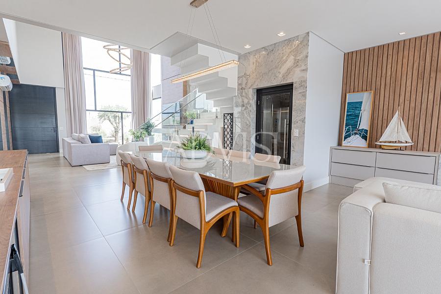 O imóvel conta com 5 suítes, sendo uma no térreo, além de duas salas de estar com lareira, adega para vinhos, espaço gourmet com churrasqueira e chopeira, e elevador que conecta todos os pavimentos. A suíte master dispõe de amplo closet e uma vista espetacular para o lago.
